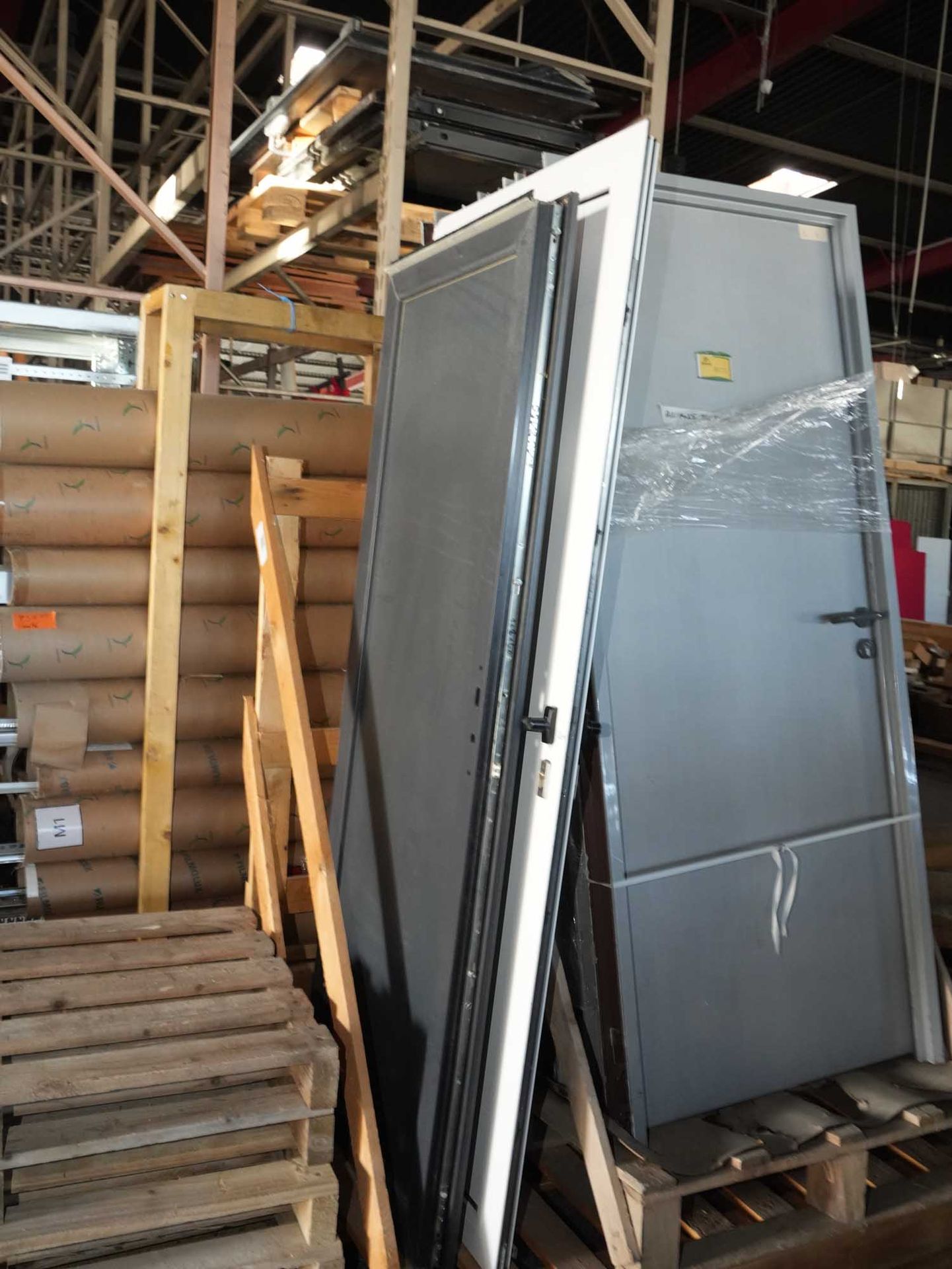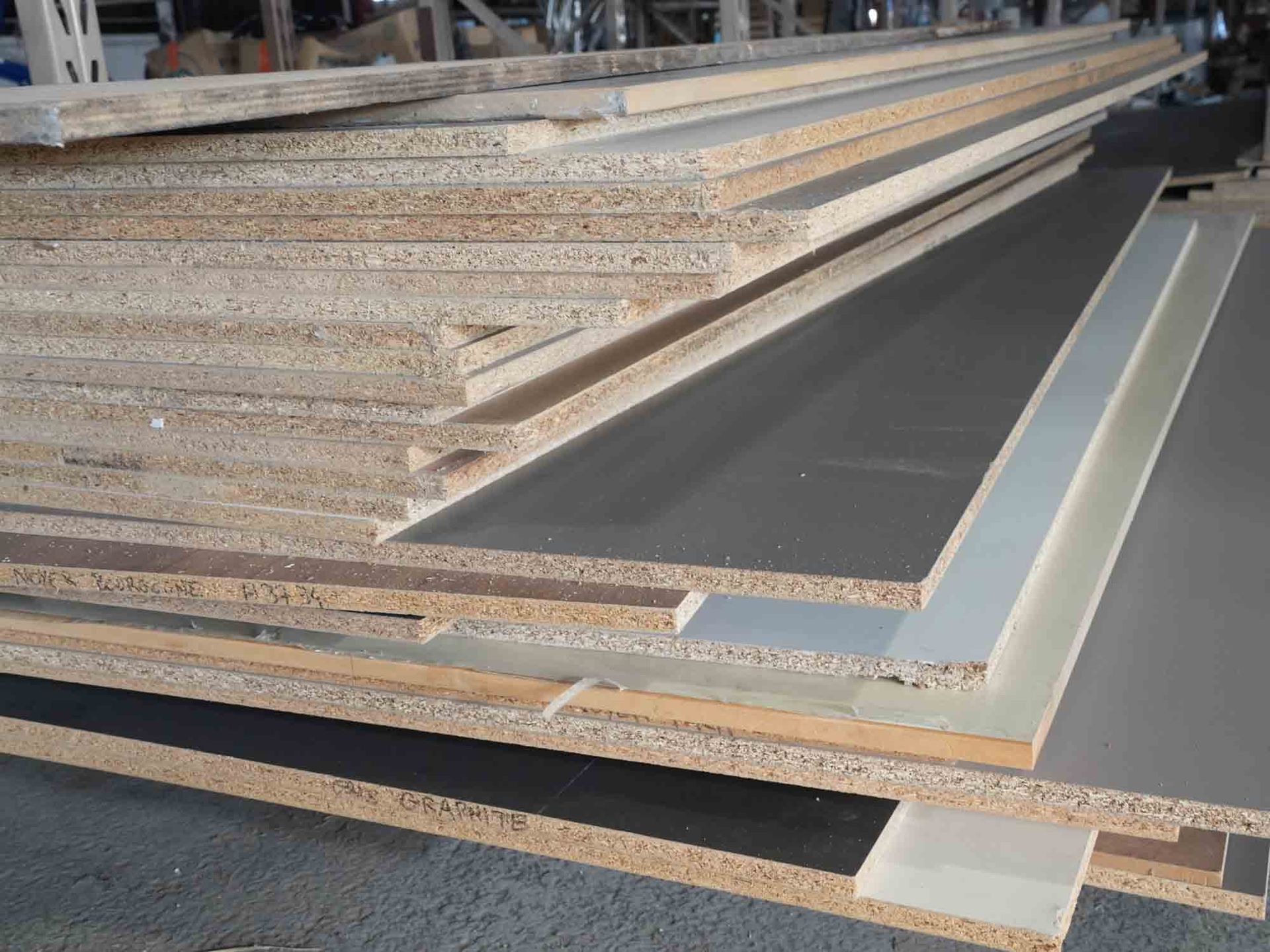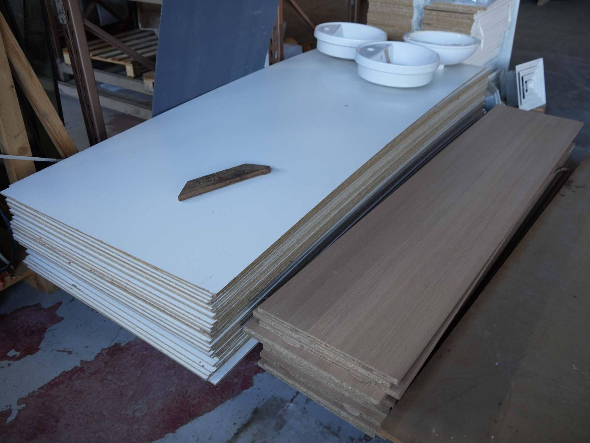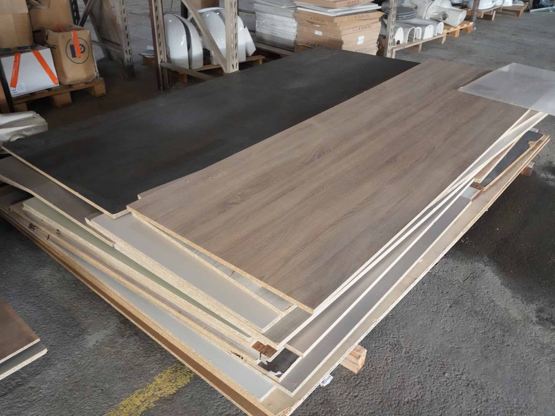 nombreuses menuiseries PVC, très grand lot de plots de terrasse (plusieurs dimensions), palettes de tuiles, plaques de mélaminé, isolants PU, plateaux avec vasques d’angle, grand lot de rouleaux de moquette (nombreuses couleurs), modules de cuisine, banque d’accueil, etc.