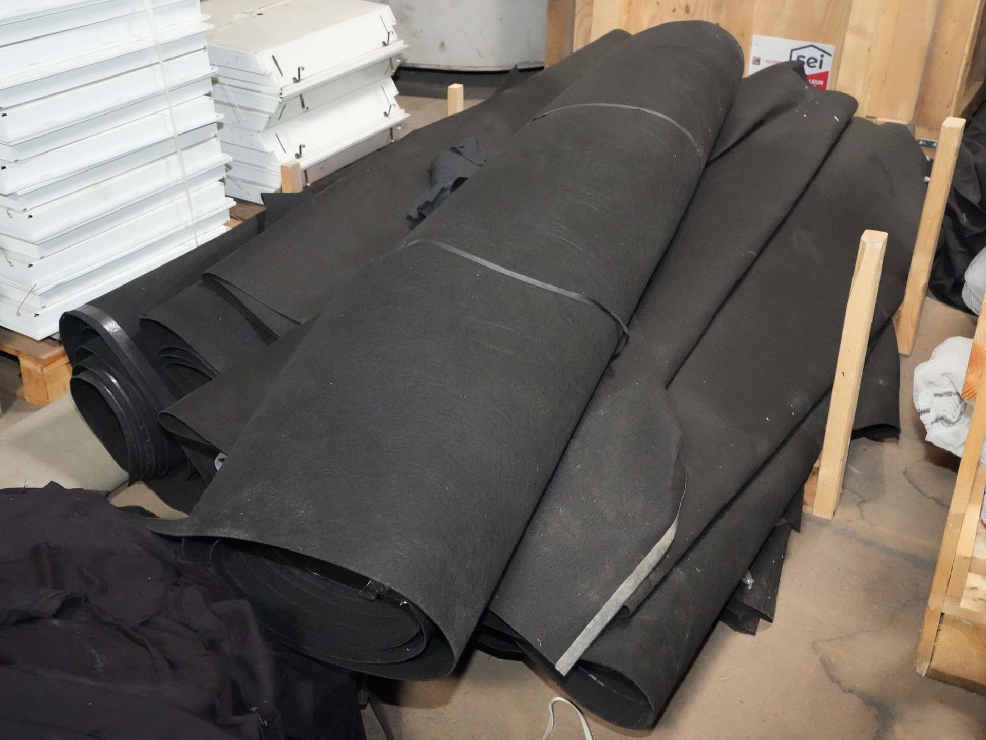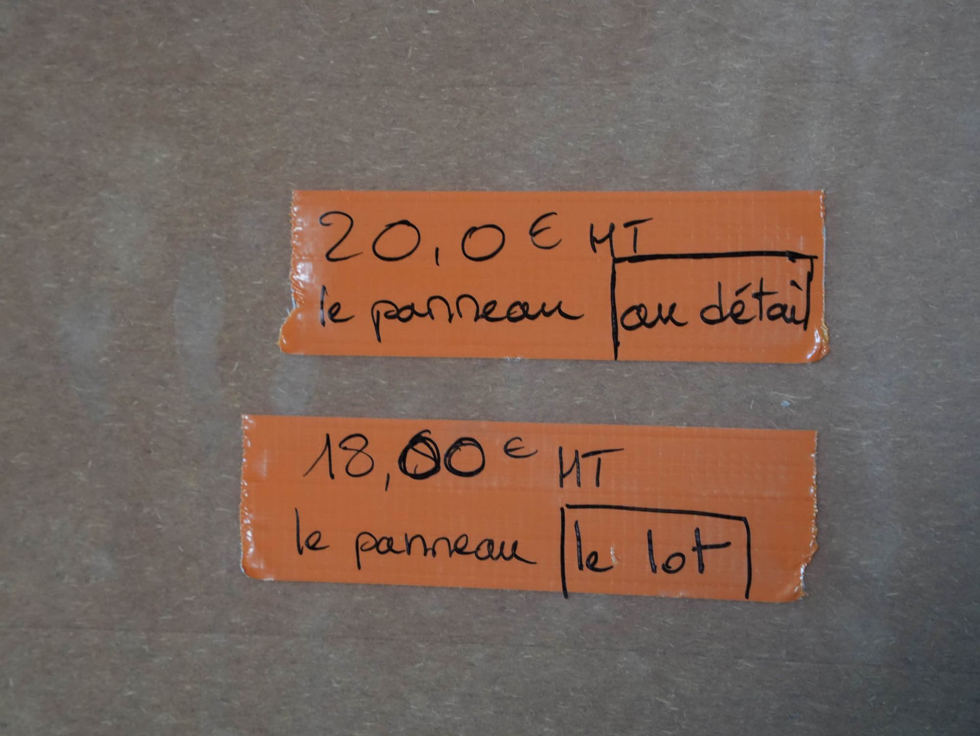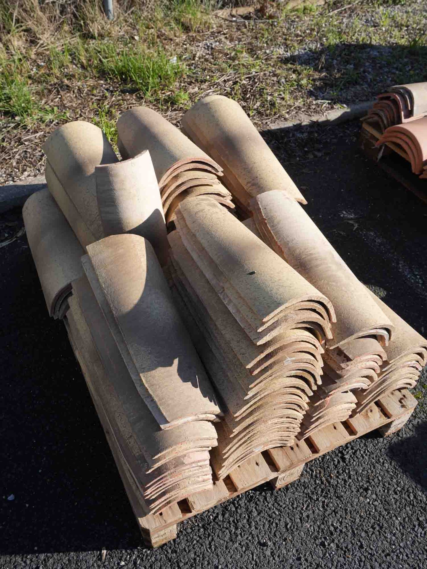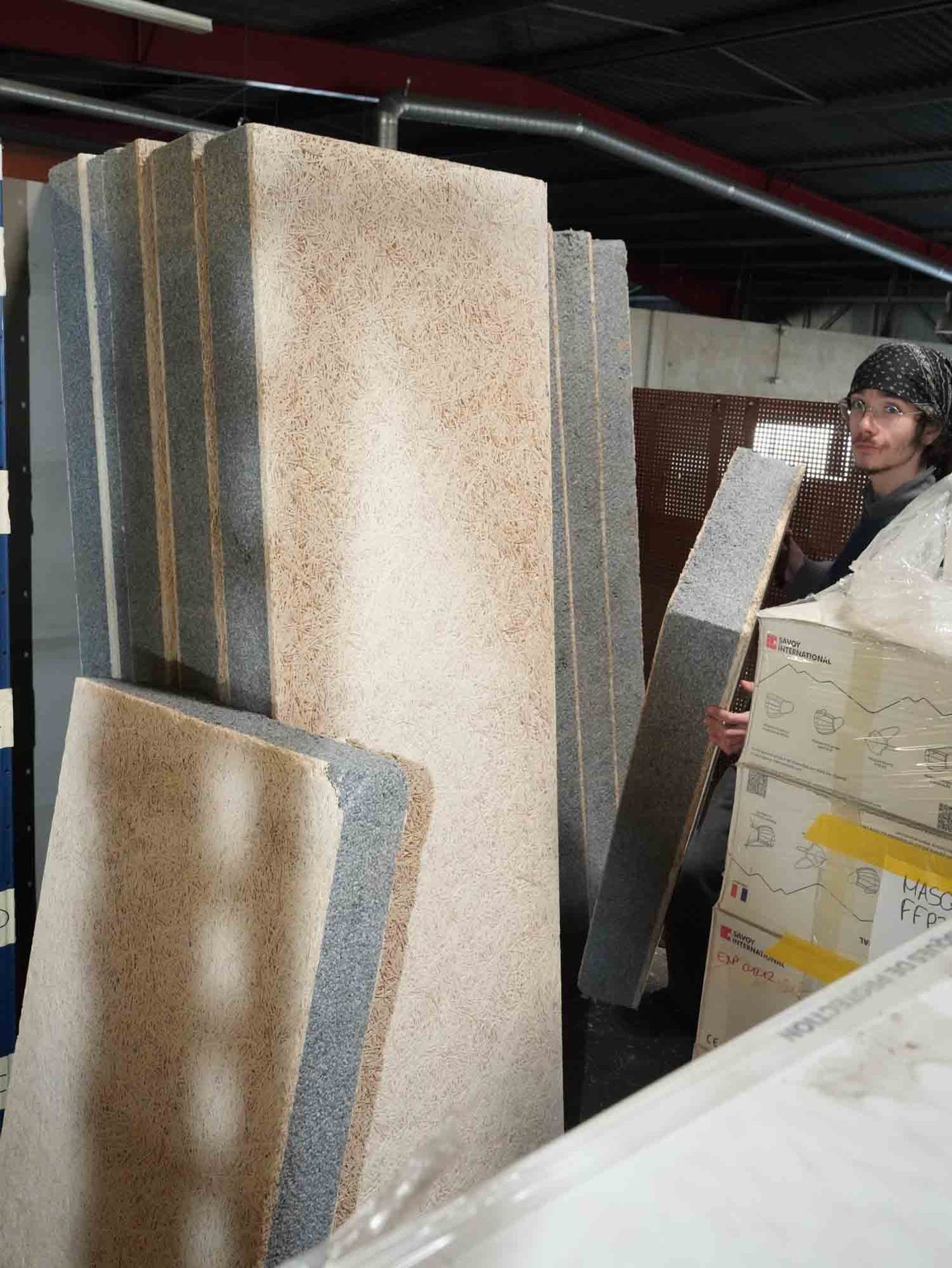 nombreuses menuiseries PVC, très grand lot de plots de terrasse (plusieurs dimensions), palettes de tuiles, plaques de mélaminé, isolants PU, plateaux avec vasques d’angle, grand lot de rouleaux de moquette (nombreuses couleurs), modules de cuisine, banque d’accueil, etc.