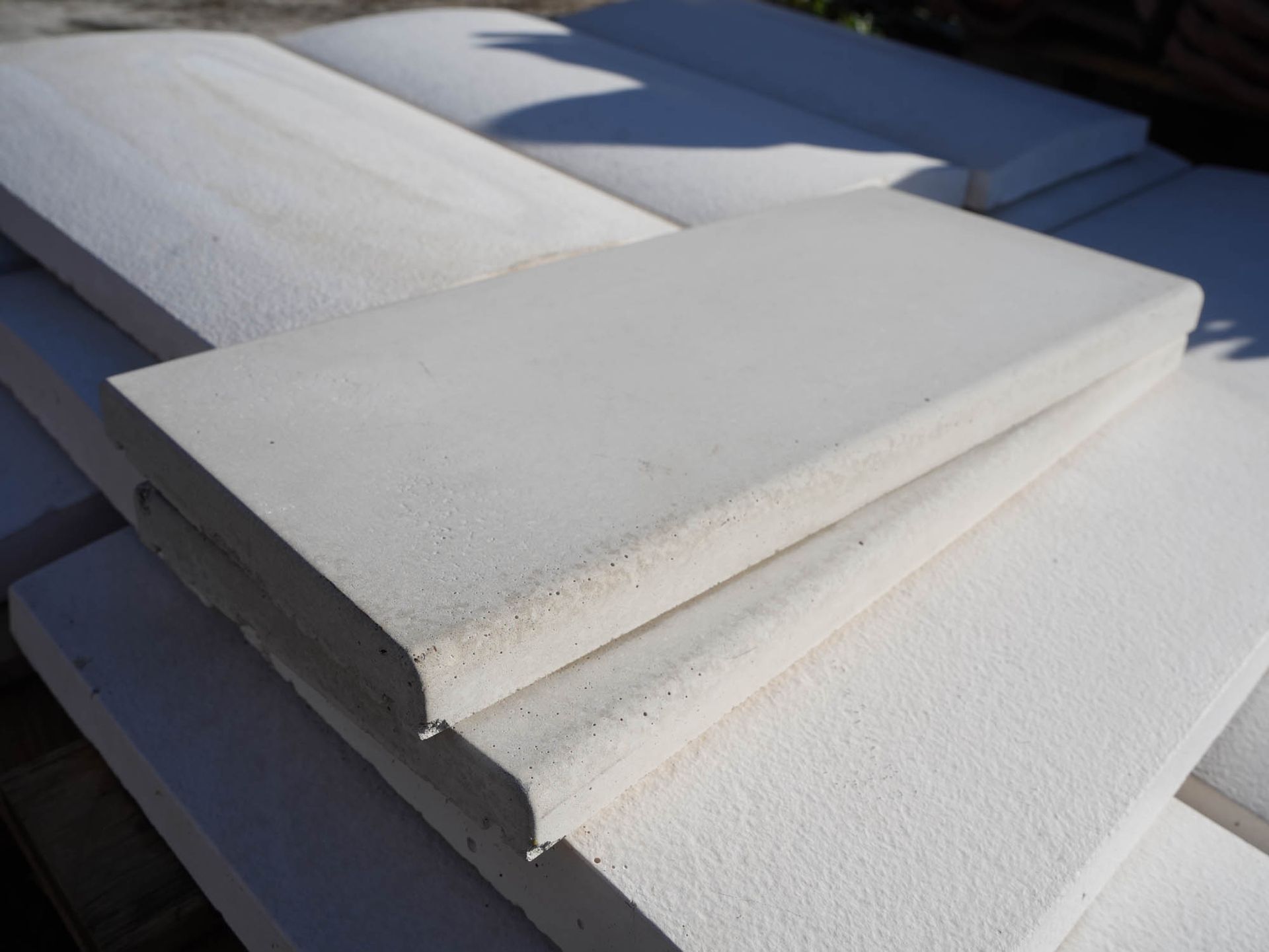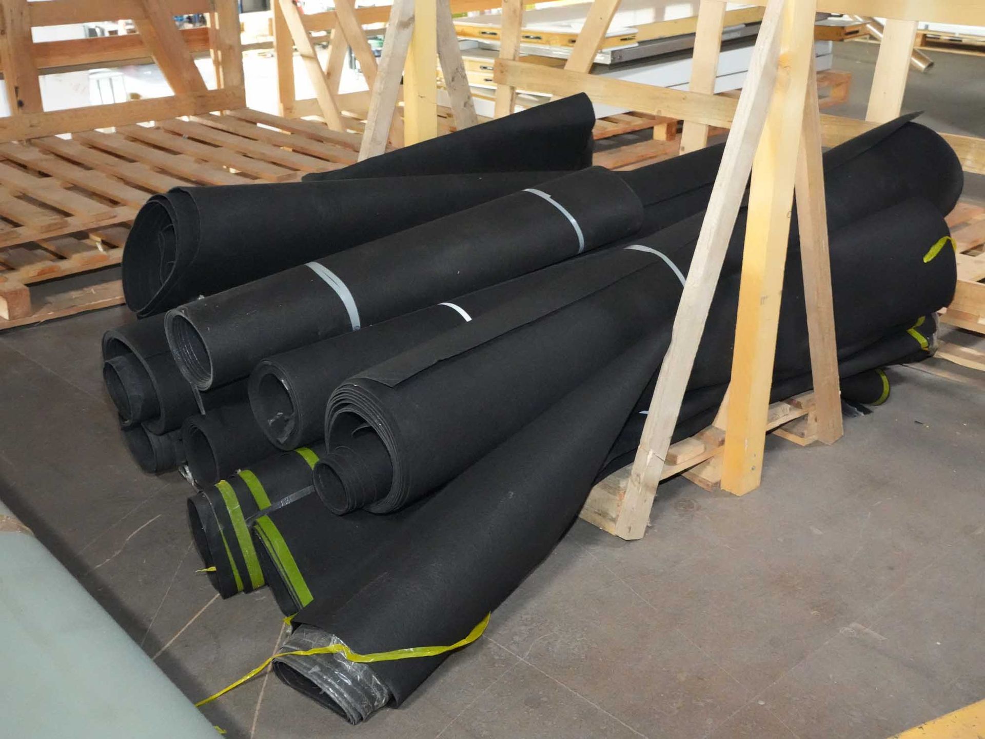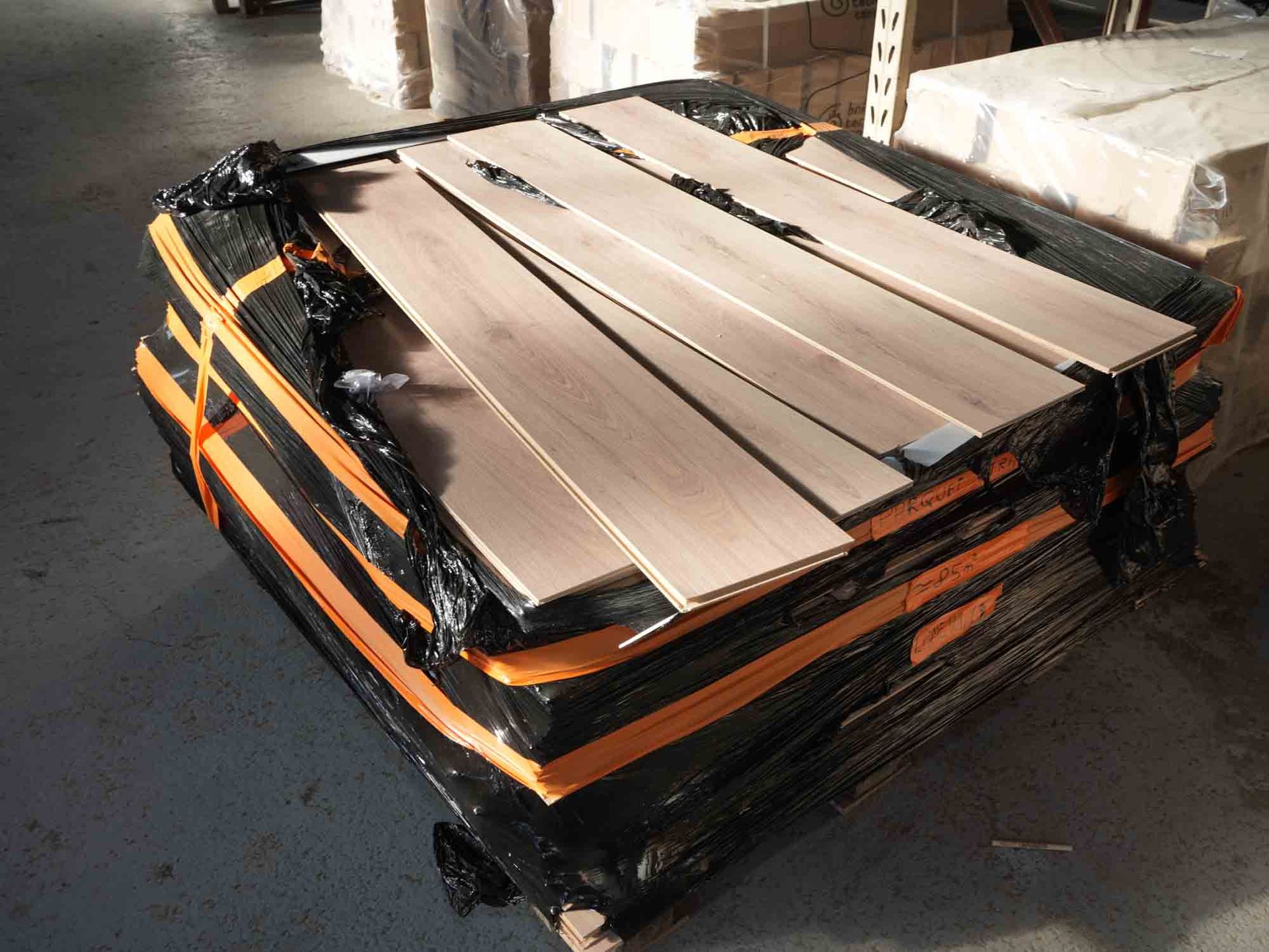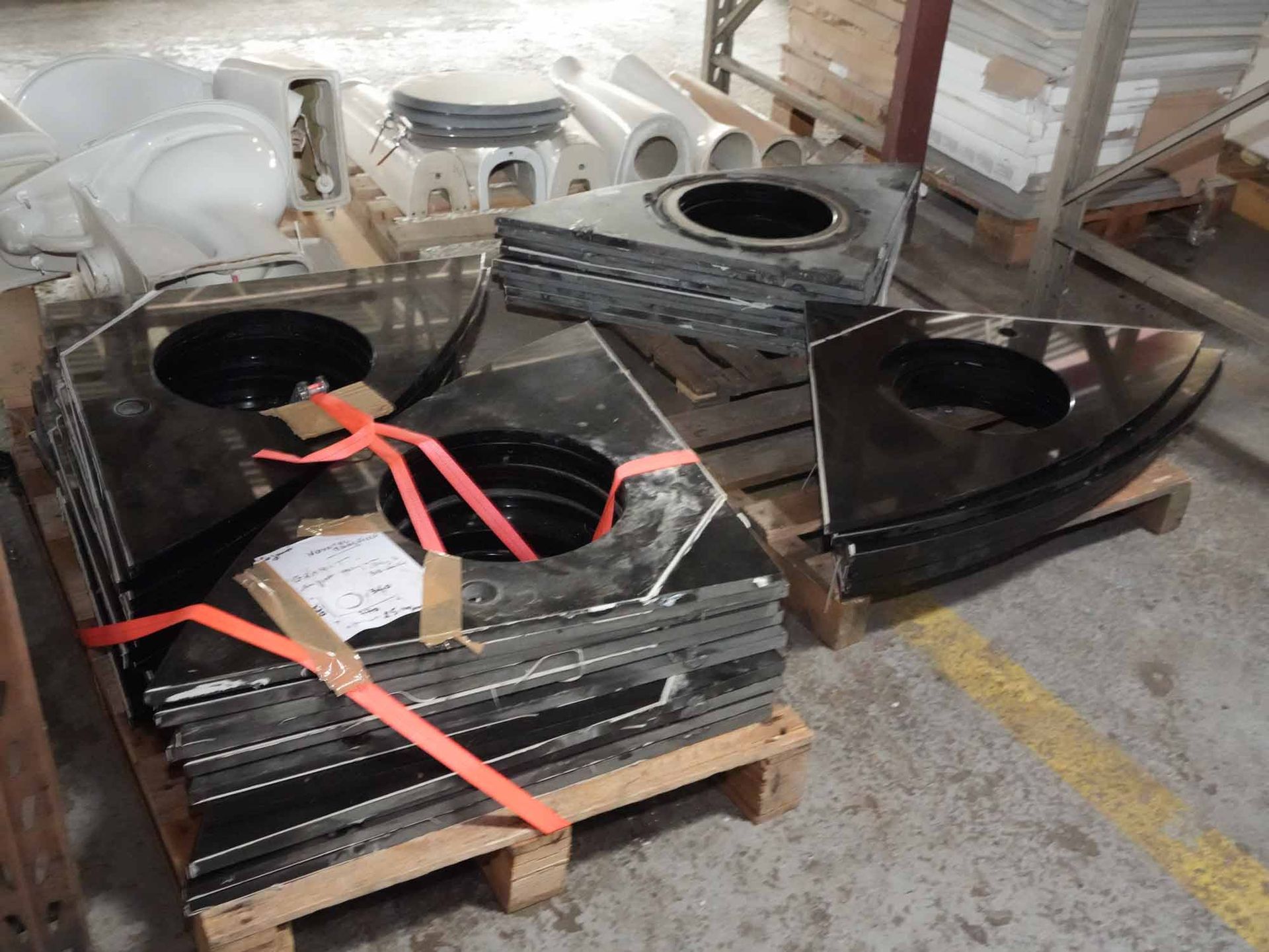 nombreuses menuiseries PVC, très grand lot de plots de terrasse (plusieurs dimensions), palettes de tuiles, plaques de mélaminé, isolants PU, plateaux avec vasques d’angle, grand lot de rouleaux de moquette (nombreuses couleurs), modules de cuisine, banque d’accueil, etc.