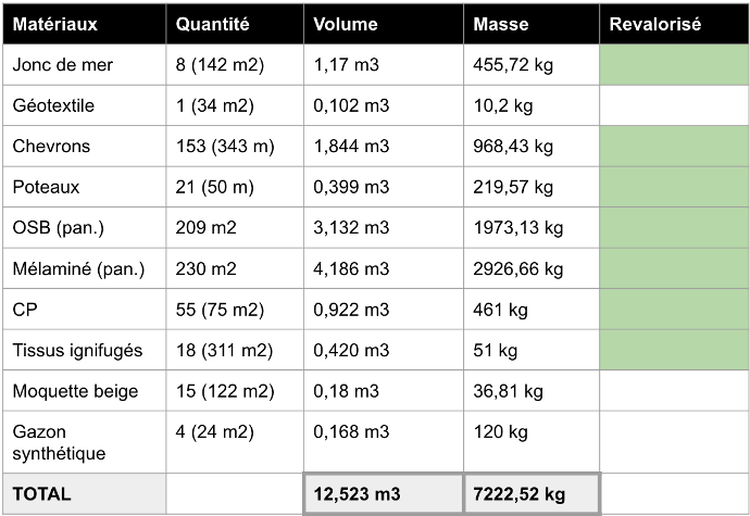Malgré tout notre petite démarche de collecte a permis de sauver de la benne une grande quantité de matériaux comme le montre le tableau.