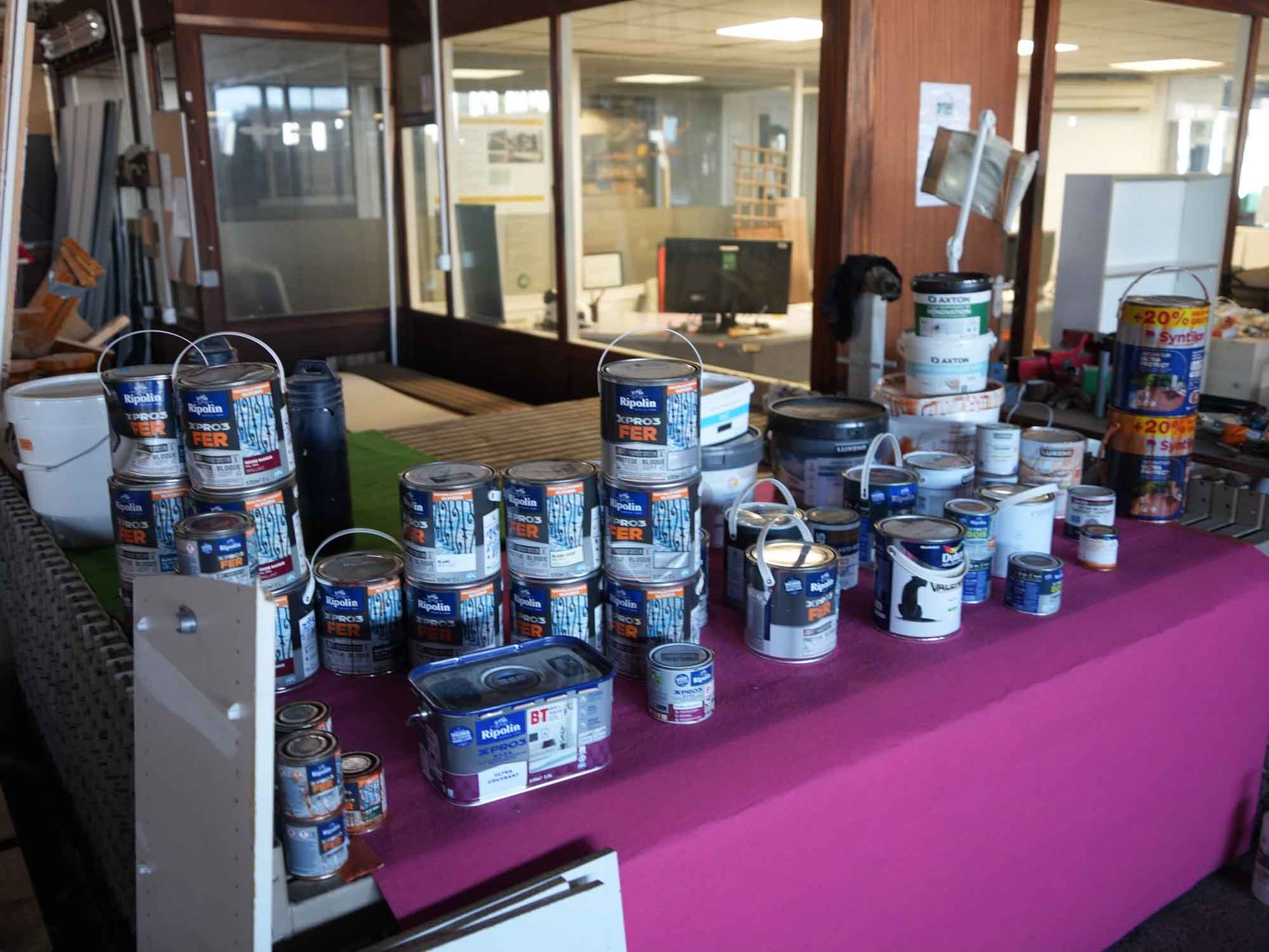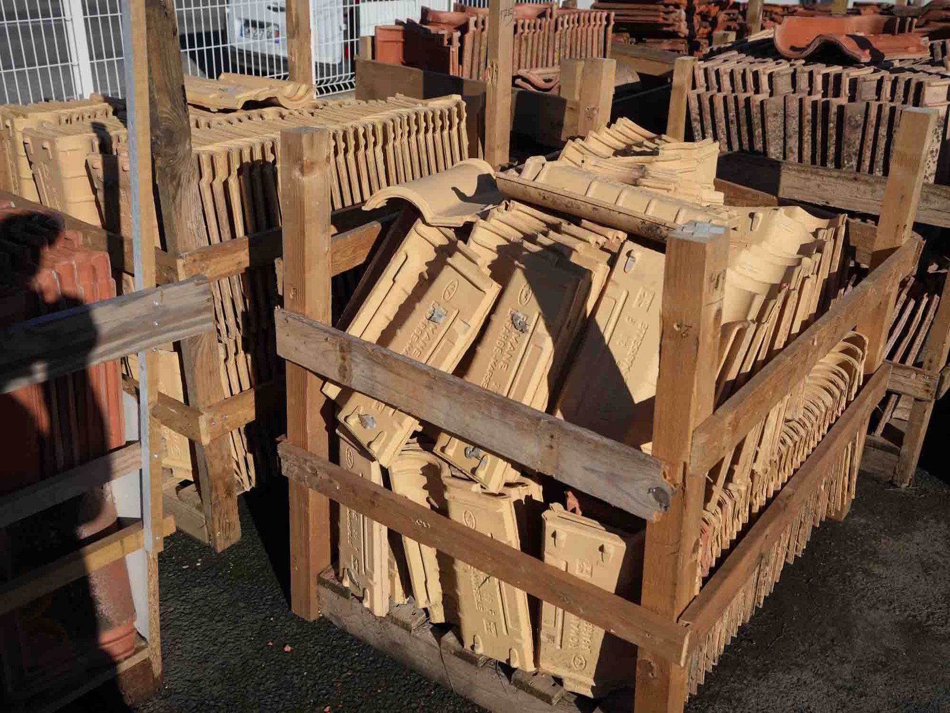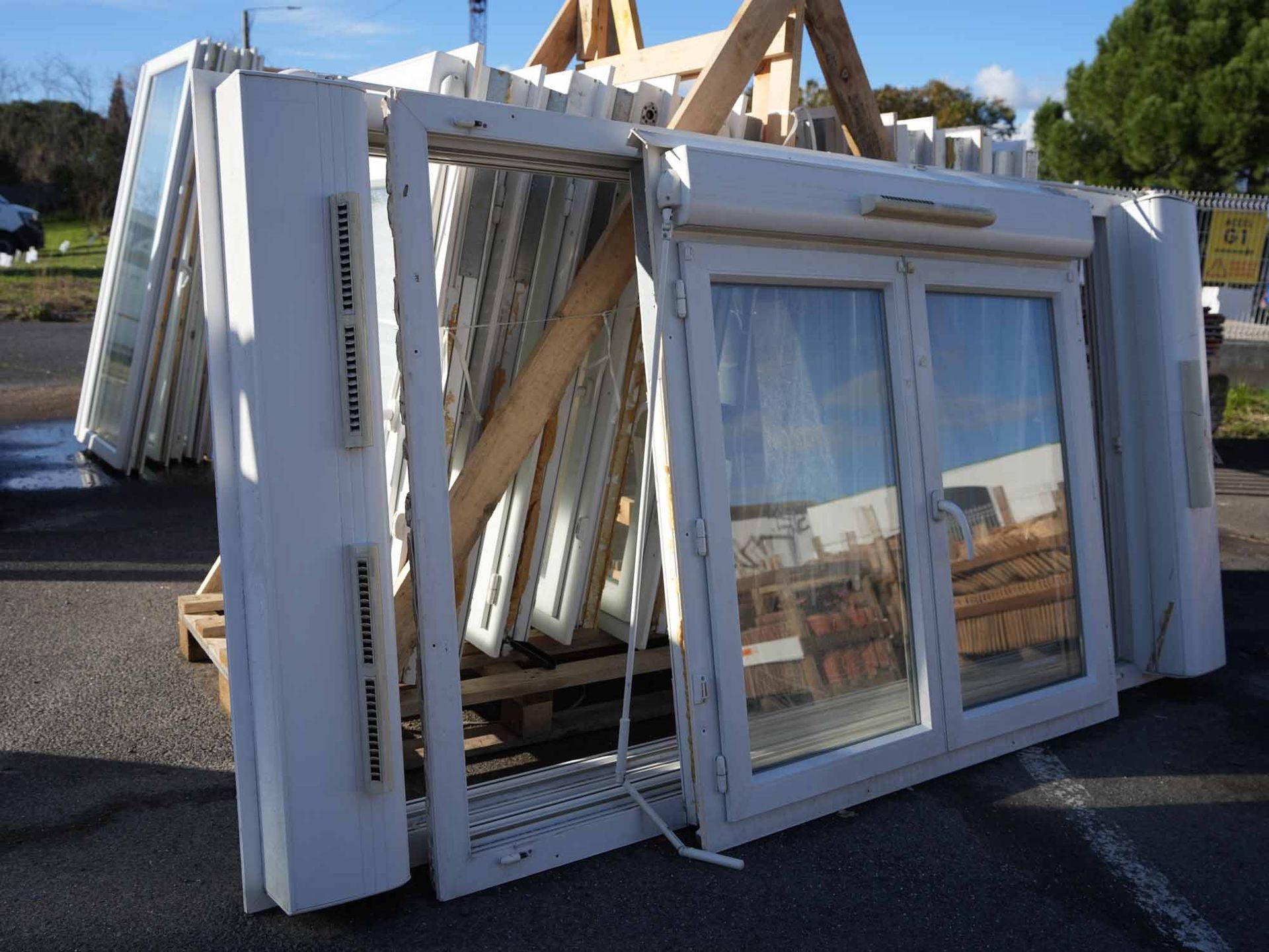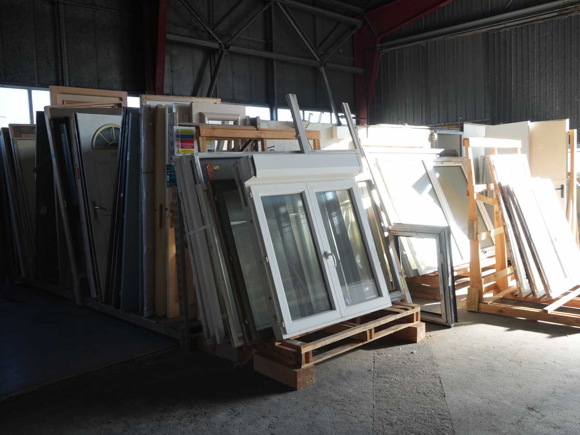 nombreuses menuiseries PVC, très grand lot de plots de terrasse (plusieurs dimensions), palettes de tuiles, plaques de mélaminé, isolants PU, plateaux avec vasques d’angle, grand lot de rouleaux de moquette (nombreuses couleurs), modules de cuisine, banque d’accueil, etc.