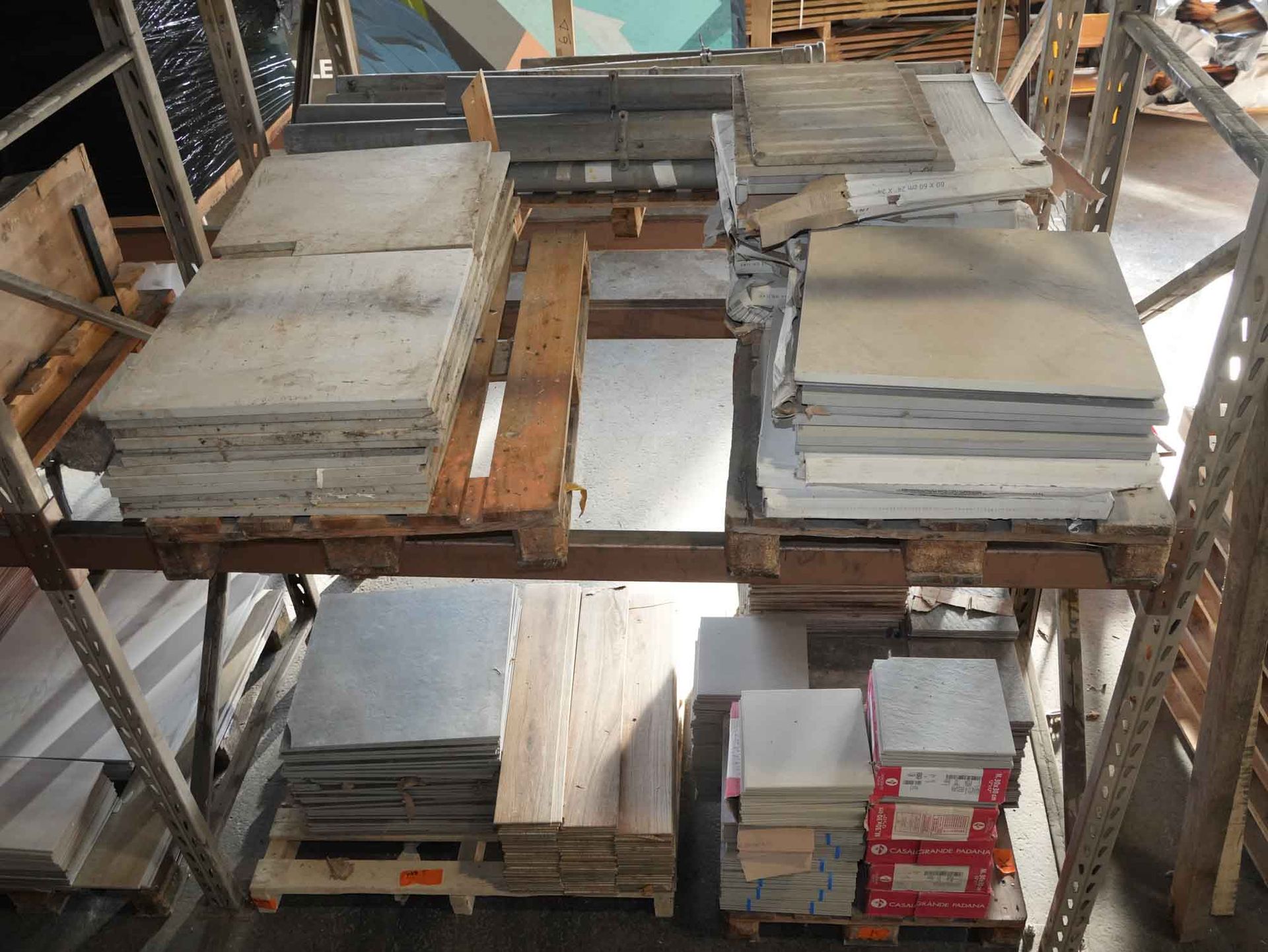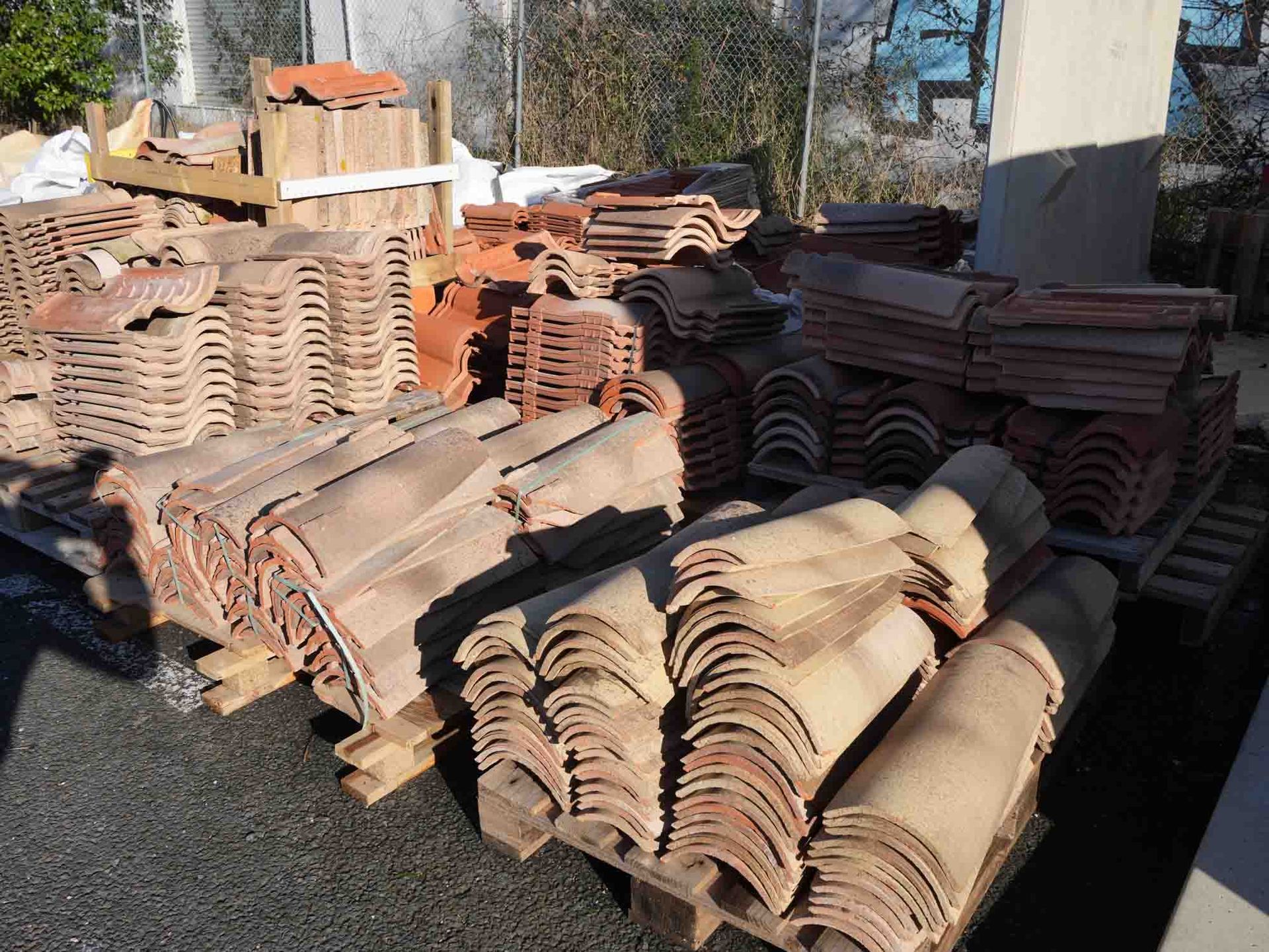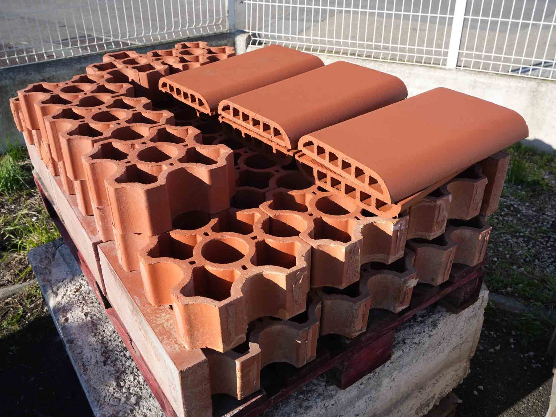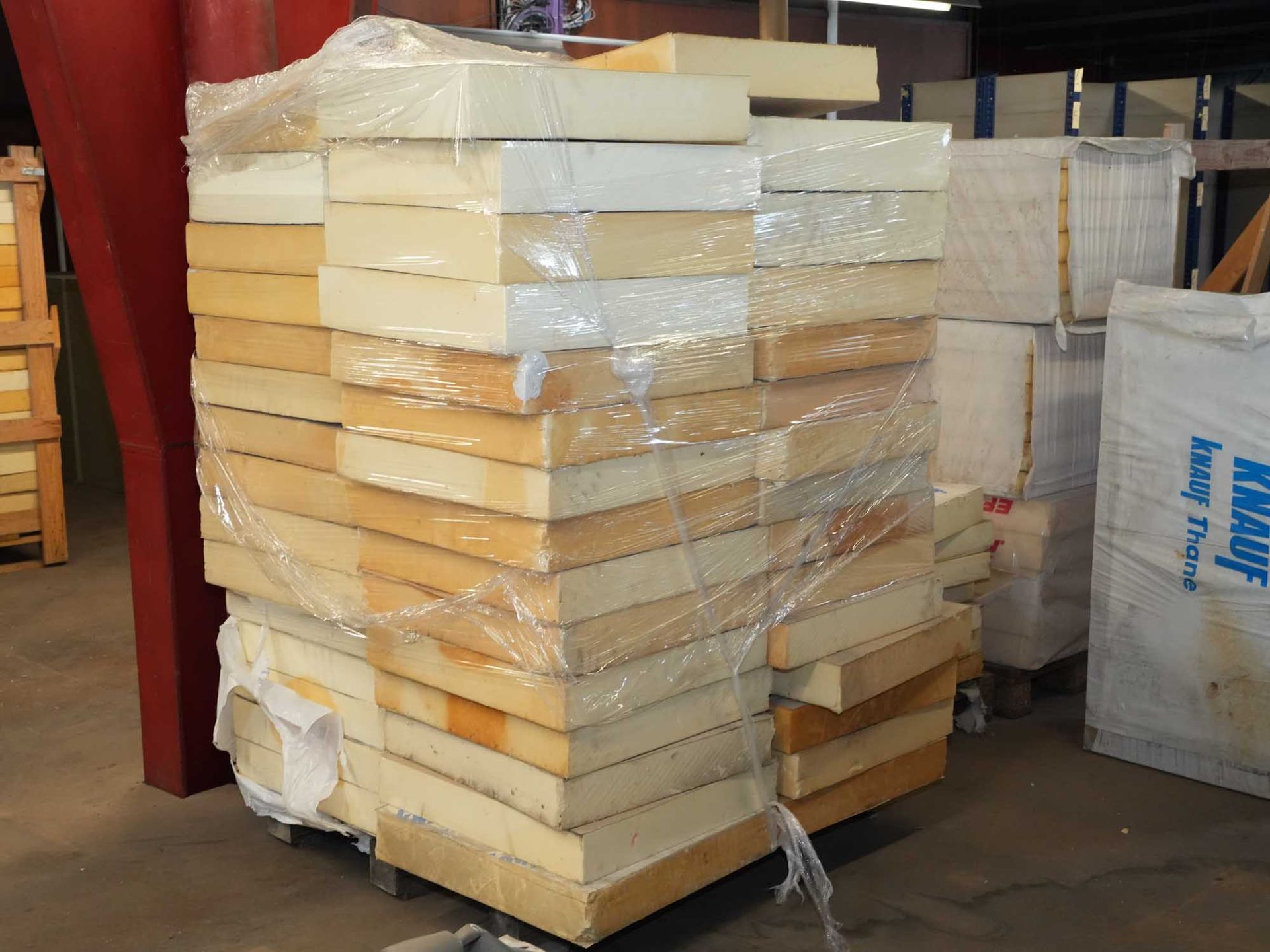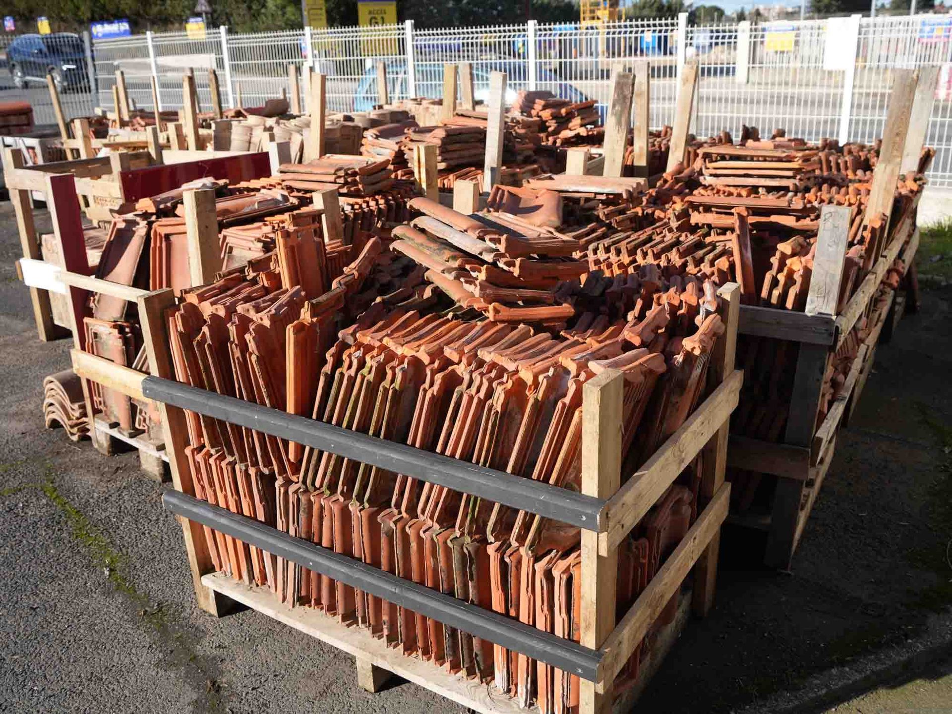 nombreuses menuiseries PVC, très grand lot de plots de terrasse (plusieurs dimensions), palettes de tuiles, plaques de mélaminé, isolants PU, plateaux avec vasques d’angle, grand lot de rouleaux de moquette (nombreuses couleurs), modules de cuisine, banque d’accueil, etc.